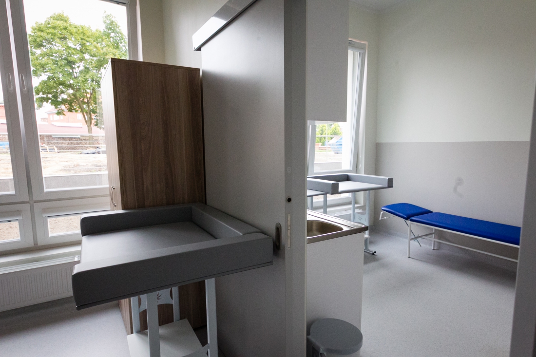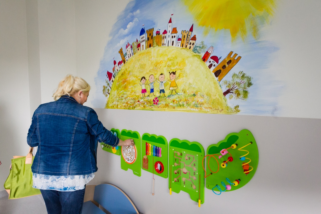 Na parterze nowego skrzydła przyjmować będą pediatrzy. Z myślą o naszych najmłodszych pacjentach oraz ich opiekunach stworzyliśmy salę zabaw, która znajduje się w niezależnym pomieszczeniu, jednak tuż obok gabinetów lekarskich. Dzieci w oczekiwaniu na wizytę u lekarza mogą miło spędzić czas: pobawić się lub porysować. W toaletach (zarówno w damskiej, jak i w męskiej) zamontowano przewijaki dla niemowląt. Dzięki temu zarówno każda mama, jak i każdy tata będą mogli w komfortowych warunkach zadbać o pielęgnację swojego dziecka. Dodatkowo tuż przy wejściu do przychodni znajduje się pomieszczenie, w którym można pozostawić wózek dla dziecka.