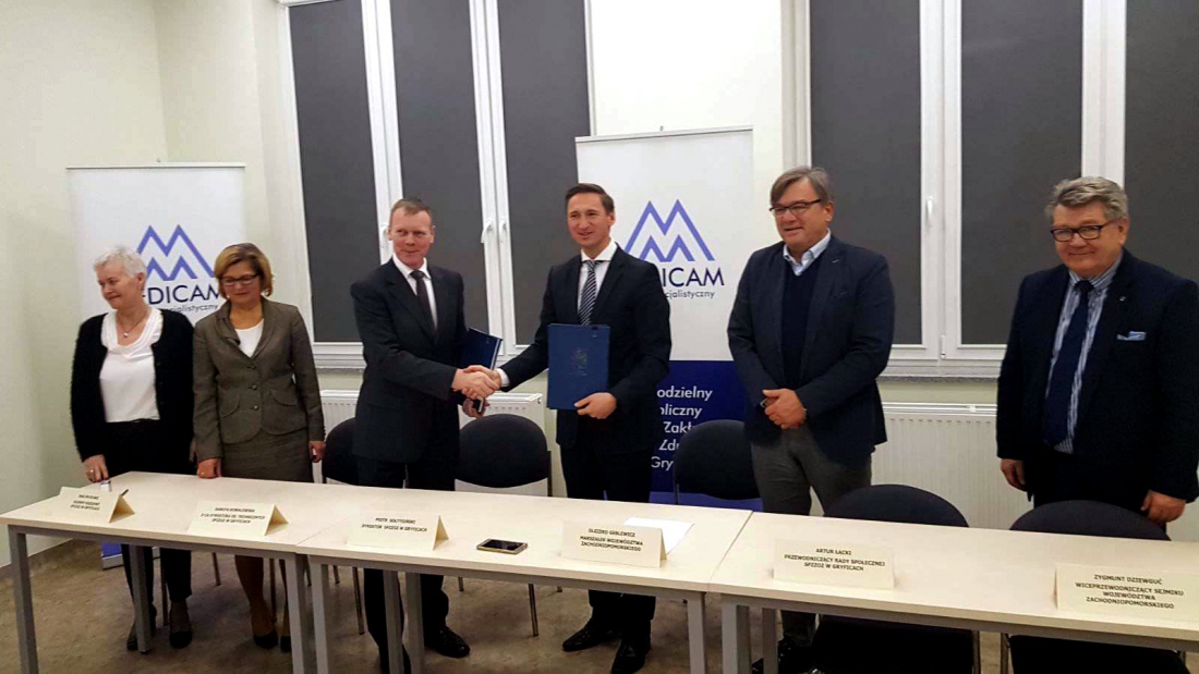 Dużo pozytywnych zmian czeka pacjentów lecznicy w Gryficach, która rozpoczyna kolejne medyczne przedsięwzięcie. Inwestycja obejmuje przebudowę obiektu, jak i jego doposażenie. O skali działańw placówce świadczy m.in. koszt modernizacji. To aż 35 mln zł, z czego ponad 31 mln zł pochodzić będzie ze środków RPO WZ 2014-2020. Umowę pozwalającą na uruchomienie unijnego wsparcia podpisał w środę, 22 listopada 2017 roku w Gryficach marszałek Olgierd Geblewicz oraz dyrektor Piotr Sołtysiński. Towarzyszyli im radni województwa Zygmunt Dziewguć i Artur Łącki.