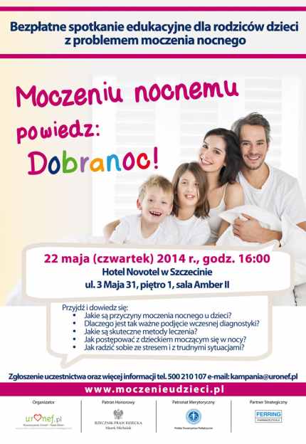 o godzinie 16:00 w hotelu Novotel w SZCZECINIE przy ulicy 3 Maja 31 (piętro 1, sala Amber II) kampania@uronef.pl [1]odbędzie się bezpłatne spotkanie edukacyjne dla rodziców dzieci z problemem moczenia nocnego. Zgłoszenie uczestnictwa oraz więcej informacji pod numerem telefonu 500 210 107 lub e-mailem kampania@uronef.pl [1]